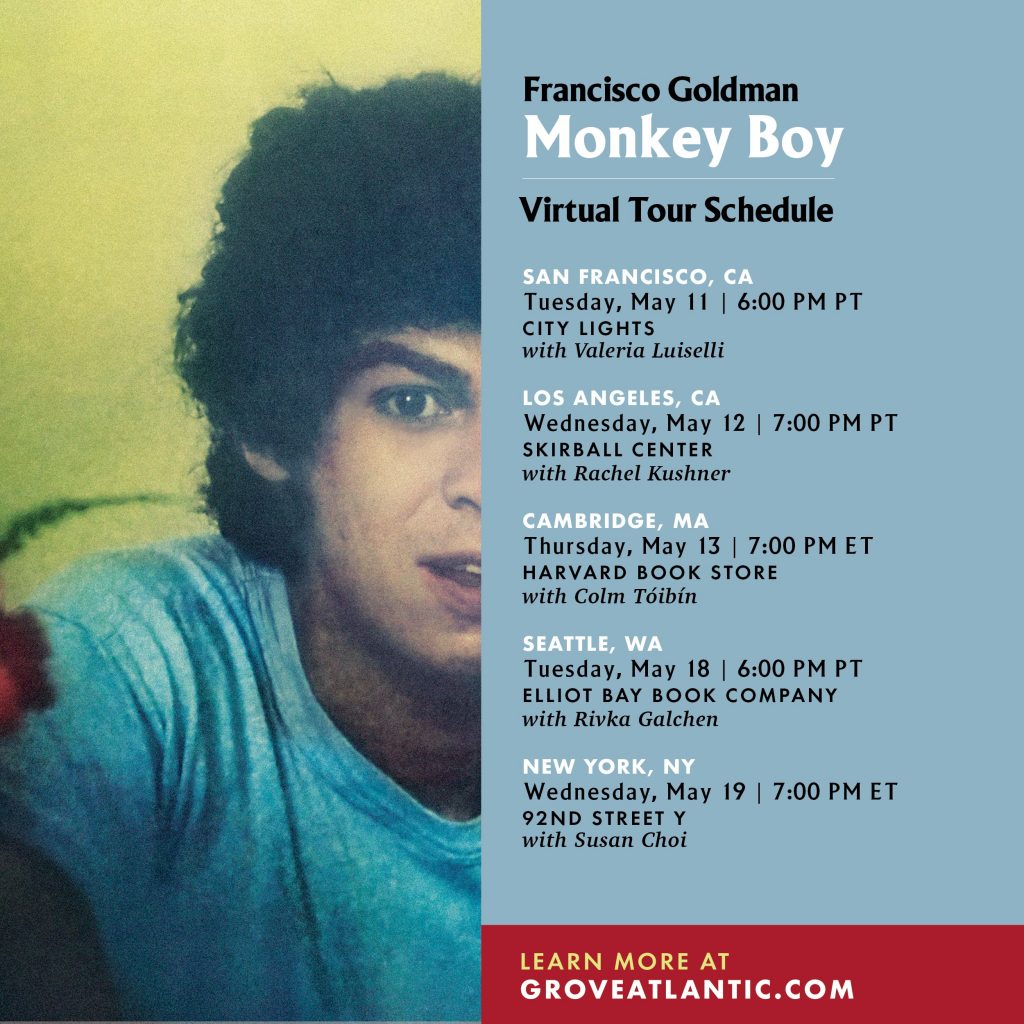 Last week, we had the joy of publishing Monkey Boy, the lyrical new novel by Francisco Goldman, revered author of Say Her Name and The Art of Political Murder. Telling the story of a middle-aged writer of both Guatemalan and Ukrainian-Jewish heritage taking stock of his life, family, and career, it’s already proved a critical smash: O, the Oprah Magazine calls it both “a tour de force” and “an enthralling autofiction”; in a starred review, Kirkus writes, “The warmth and humanity of Goldman’s storytelling are impossible to resist.” We’re delighted to share some great news: Francisco’s going on tour! (Virtually, of course.) Check out his schedule below, and click for more info and links to tickets.