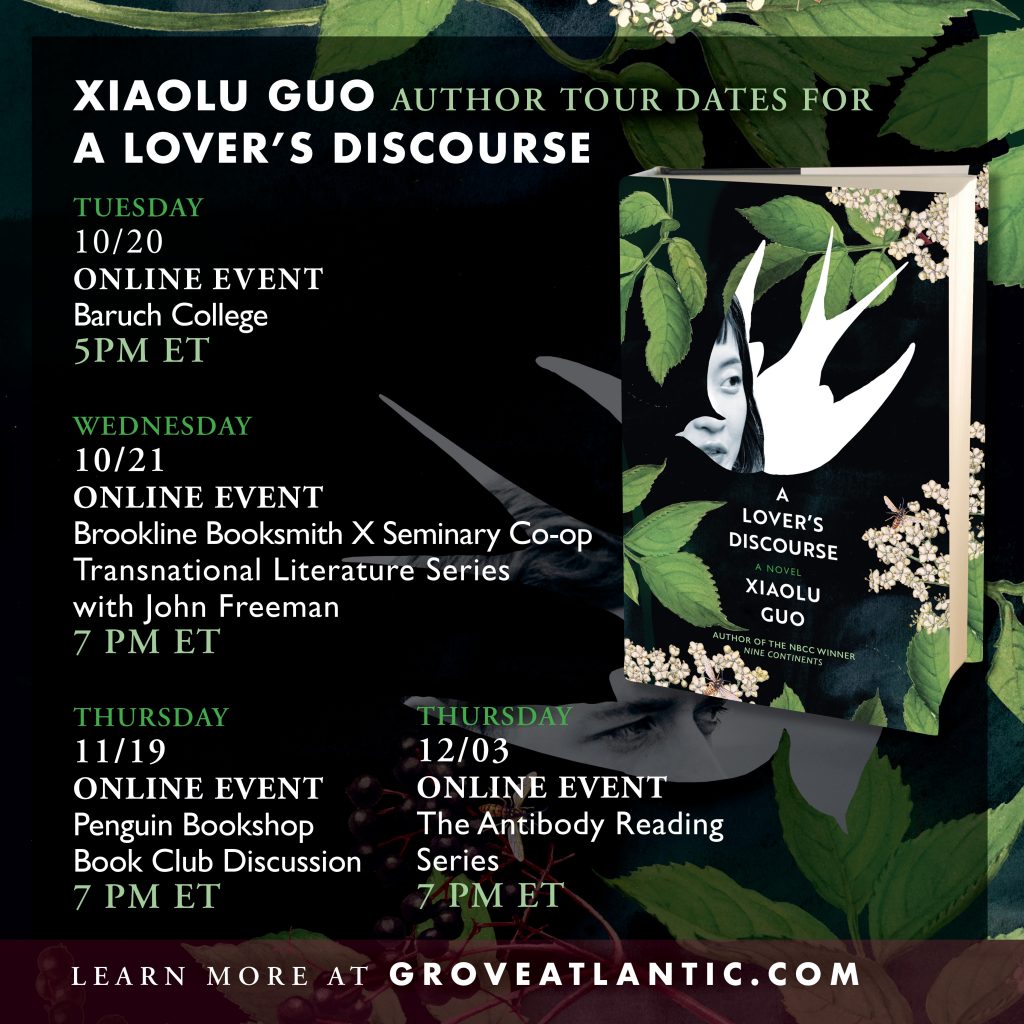 Last week, we had the pleasure 0f publishing A Lover’s Discourse, the latest from the acclaimed Xiaolu Guo. The New York Times Book Review has already weighed in, noting, “The truthfulness and accuracy of Guo’s language gives the book mischief and energy. There are shades of Lydia Davis in her carefully etched sentences as she details the ups and downs of the relationship without sentimentality… It’s capacious enough to touch on moments of real darkness, while somehow managing to be mordant, funny and, ultimately, life-affirming.” We’re excited about that, and excited, too, about Xiaolu’s virtual tour, which kicks off tomorrow afternoon with an event hosted by Baruch College. Don’t miss these events!